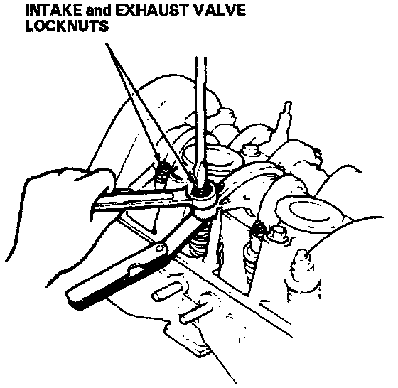 2. Loosen intake/exhaust valve rocker locknut and turn adjustment screw until feeler slides back and forth with slight amount of drag. Clearance should be: