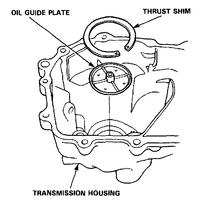 7. Remove the thrust shim and oil guide plate from the transmission housing.