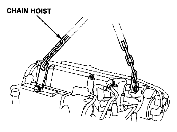 13. Install the bolts in the cylinder head and attach a chain hoist to the bolts, then lift the engine slightly to unload the mounts.