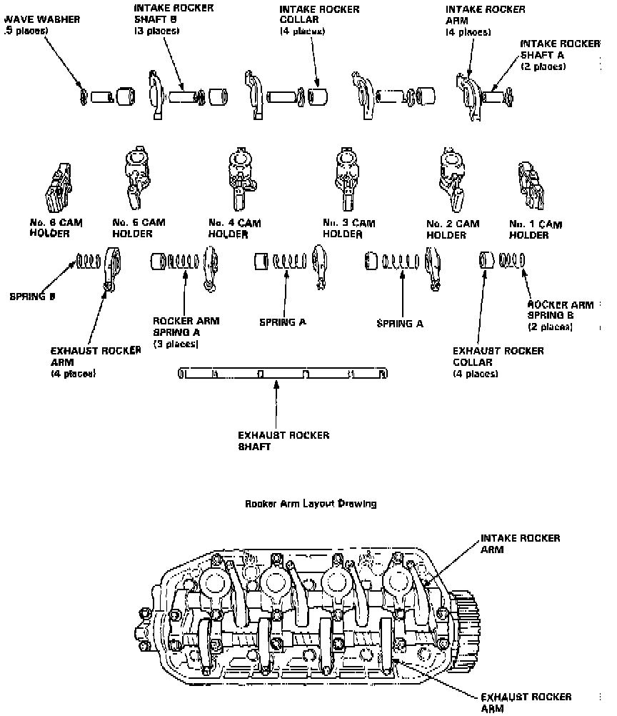 When removing or installing rocker arm assembly, do not remove camshaft holder bolts. The bolts will keep the holders, springs and rocker arms on the shaft. When reassembling, fit the projection on the intake rocker shaft to the notch in the camshaft holder.