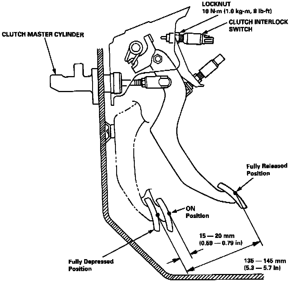 The clutch interlock switch turns on at the position where the clutch disengages: 15 - 20 mm (0.59 - 0.79 in) from the fully depressed position.