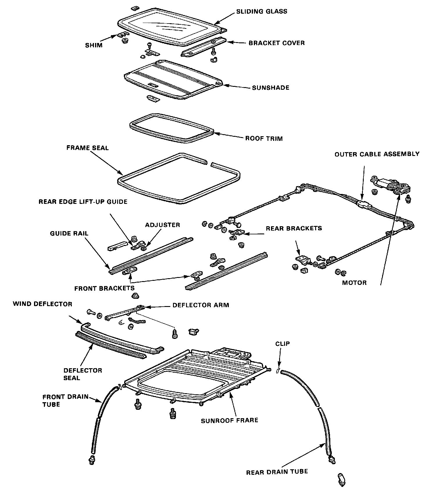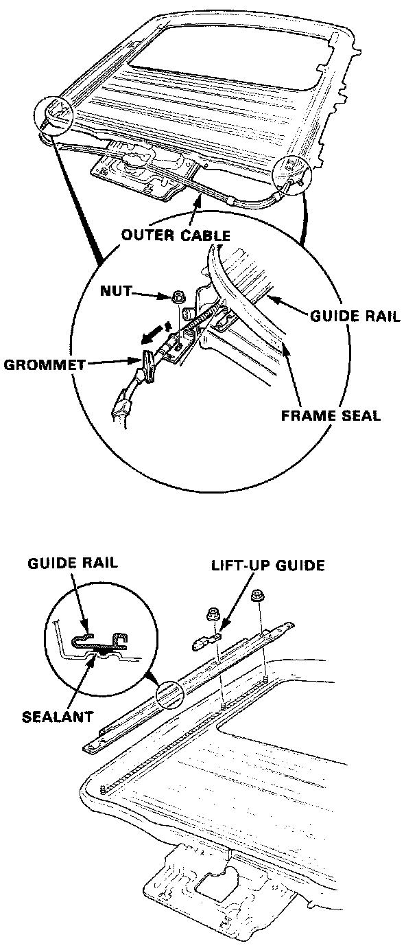 With sunroof out of the car, remove the guide rail mounting nuts, lift off the guide rails, and remove the cables with rear brackets attached.