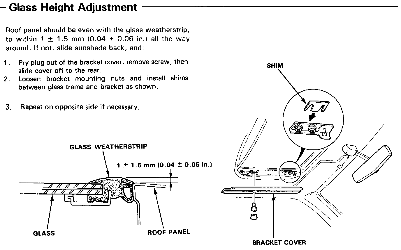 Open the glass about a foot, then close it to check where rear edge begins to rise If ii rises too soon and seats too tightly against the roof panel, or too late and does not seat tightly enough, adjust it.