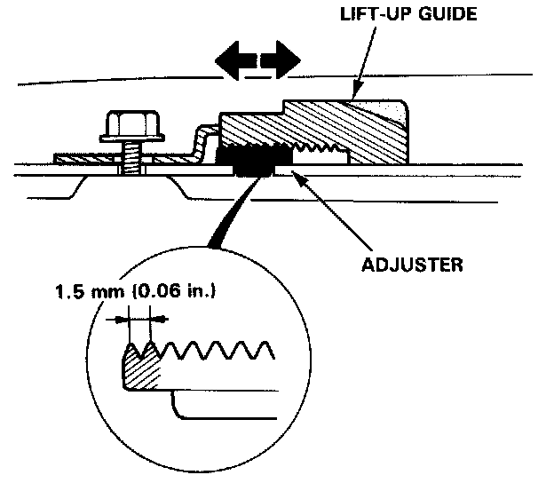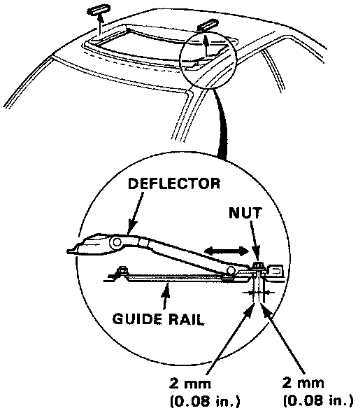 3. Move the guides forward or backward, then tighten nuts and re-check roof closing. The guides have pitches of 1.5 mm (0.06 in.) each and can be adjusted 2 pitches forward or backward.