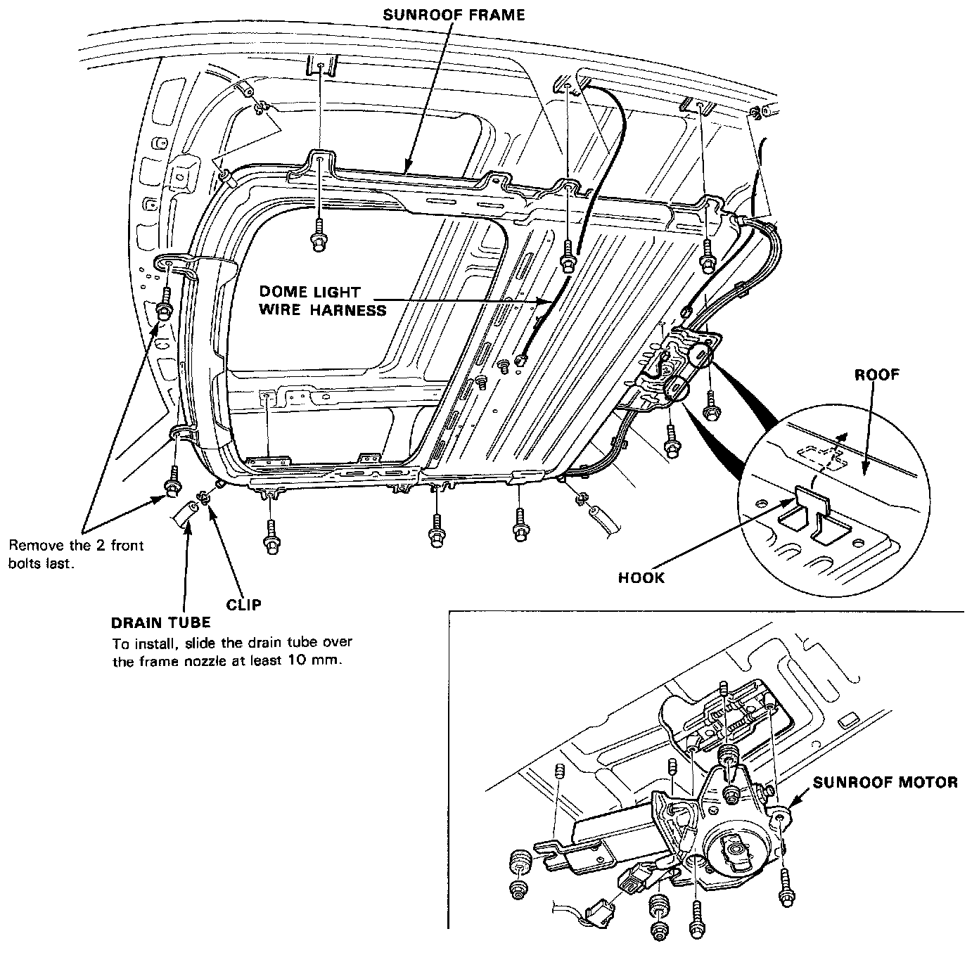 6. To install, insert the frame's rear hooks into the body holes, then install parts in the reverse order of removal. NOTE: Install the tube clips with the ends facing the side to ease installation of the headliner.