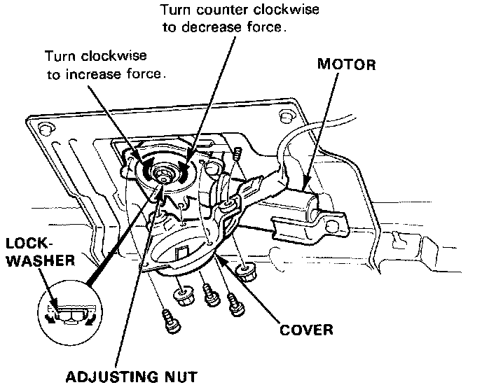2. If force is not within specification, install a new lock washer, adjust the tension by turning the sunroof motor clutch adjusting nut, and bend the lockwasher against the adjusting nut.