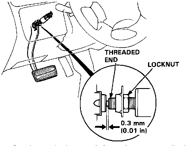 4. Screw in the brake switch until its plunger is fully depressed (threaded end touching the pad on the pedal arm). Then back off the switch 1/4 turn to make 0.01 in (0.3 mm) of clearance between the threaded end and pad. Tighten the locknut firmly. Connect the brake switch connector.