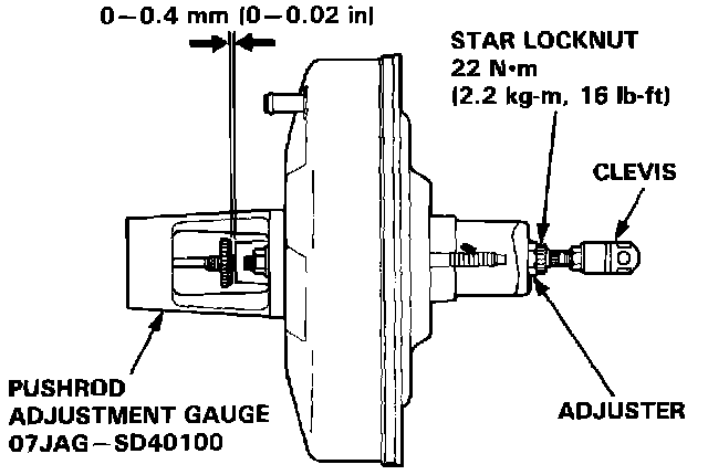 NOTE: If the clearance between the gauge body and adjusting nut is 0.02 in (0.4 mm), the pushrod-to-piston clearance is 0. However, if the clearance between the gauge body and adjusting nut is 0, the pushrod-to-piston clearance is 0.02 in (0.4 mm) or MORE. Therefore, it must be adjusted and rechecked.