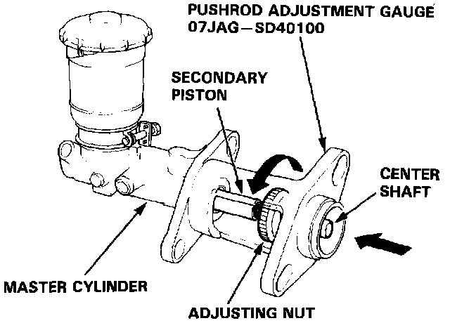 1. Set the special tool on the master cylinder body; push in the center shaft until the top of it contacts with the end of the secondary piston by turning the adjusting nut.