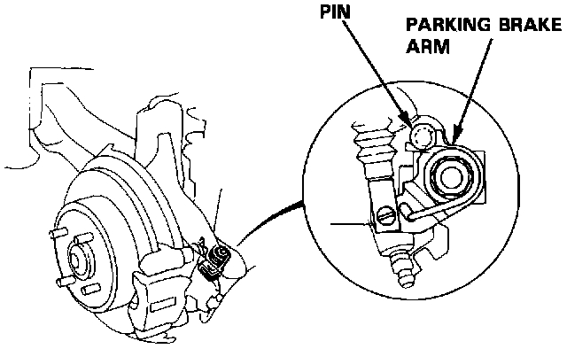 2. On cars with rear disc brakes, make sure the parking brake arm on the rear brake caliper contacts the brake caliper pin.