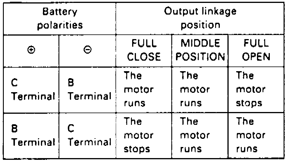 6. Check operation of actuator motor in each output linkage position according to table, Fig. 14. You should be able to hear motor.