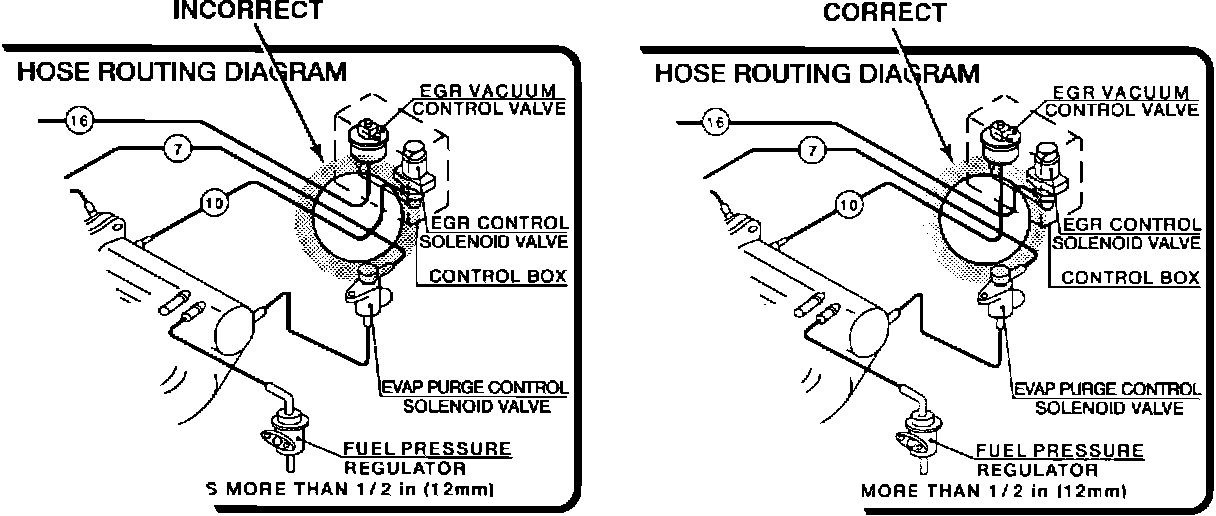 The correct label shows hose # 10 connected to the EGR vacuum control valve and hose # 16 connected to the EGR control solenoid valve.