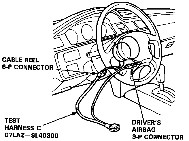 8. Disconnect the driver's airbag 3-P connector from the cable reel, then connect Test Harness C (O7LAZ-SL40300) to the driver's airbag 3-P connector.