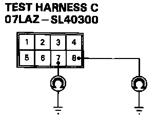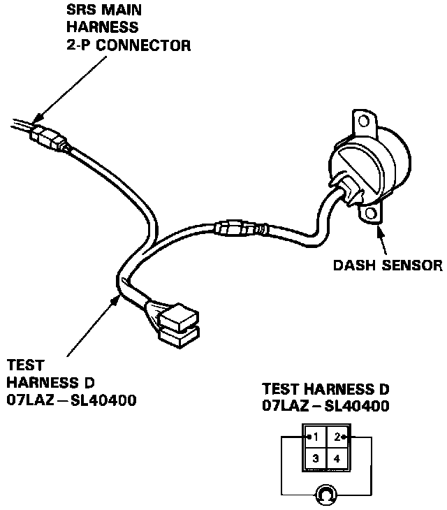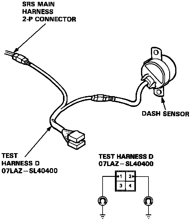 12. Connect Test Harness D (O7LAZ-SL40400) between the dash sensor and SRS main harness 2-P connector. Check continuity between the No. 1 terminal and body ground, and between the No. 2 terminal and body ground.