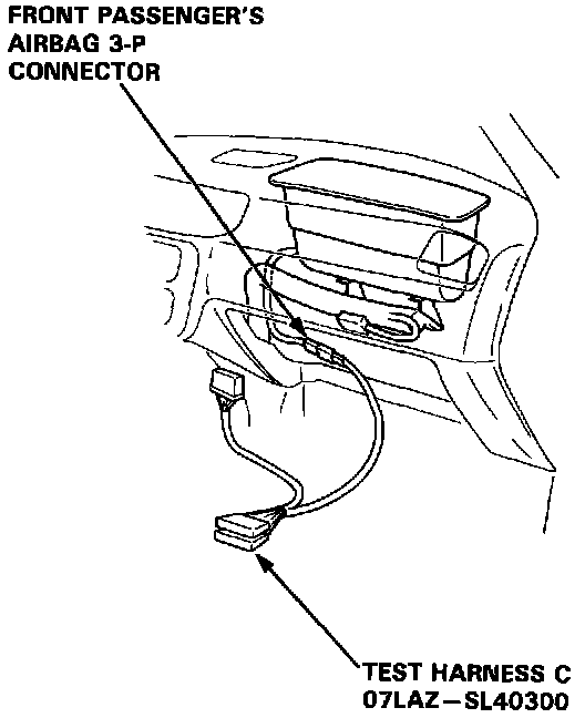 10. Disconnect the front passenger's airbag 3-P connector from the SRS main harness, then connect Test Harness C (O7LAZ-SL40300) to the airbag side of the connector.