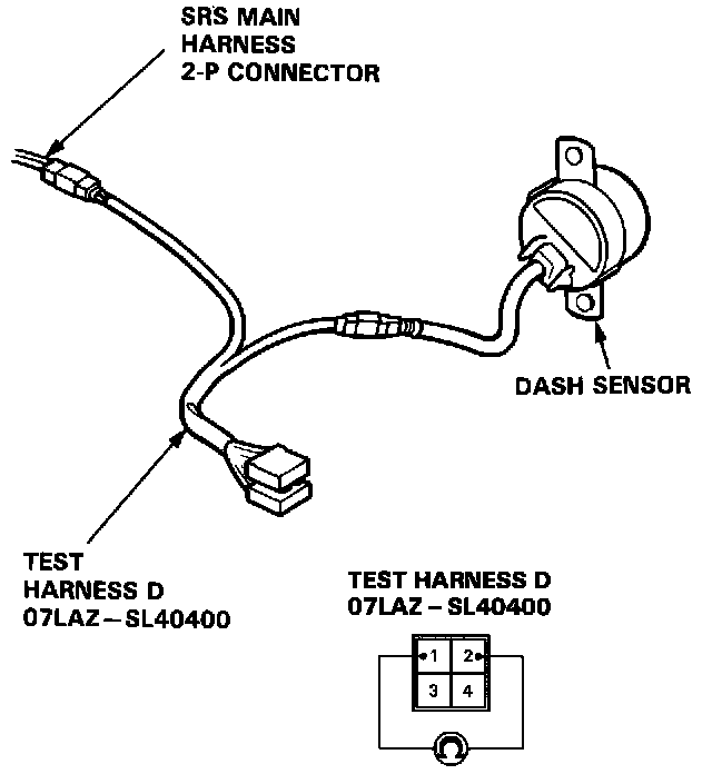 4. Connect Test Harness D (O7LAZ-SL40400) between the dash sensor and SRS main harness 2-P connector. Check the resistance between the No. 1 terminal and No. 2 terminal.