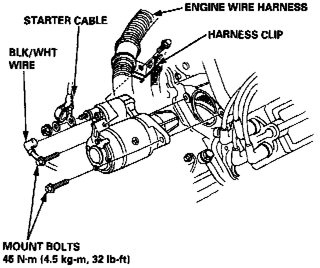 2. Disconnect the starter cable from the B terminal on the solenoid, then the BLK/WHT wire from the S terminal.