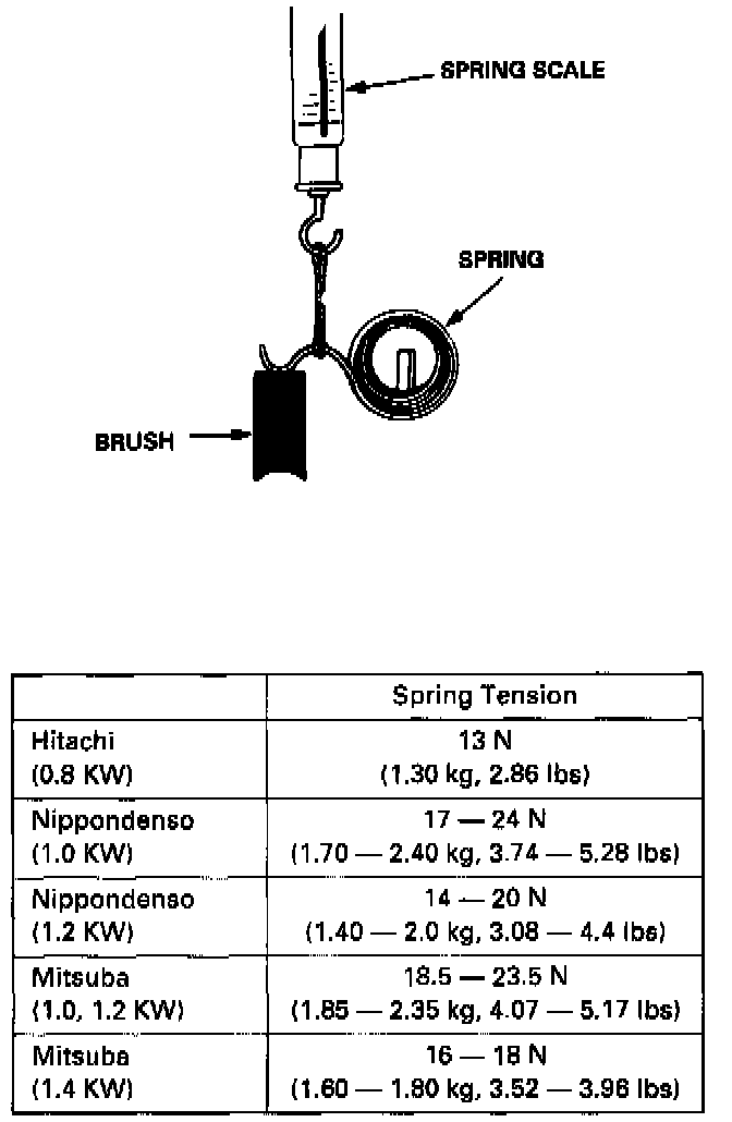 2. Insert the brush into the brush holder, and bring the brush into contact with the commutator, then attach a spring scale to the spring. Measure the spring tension at the moment the spring lifts off the brush.