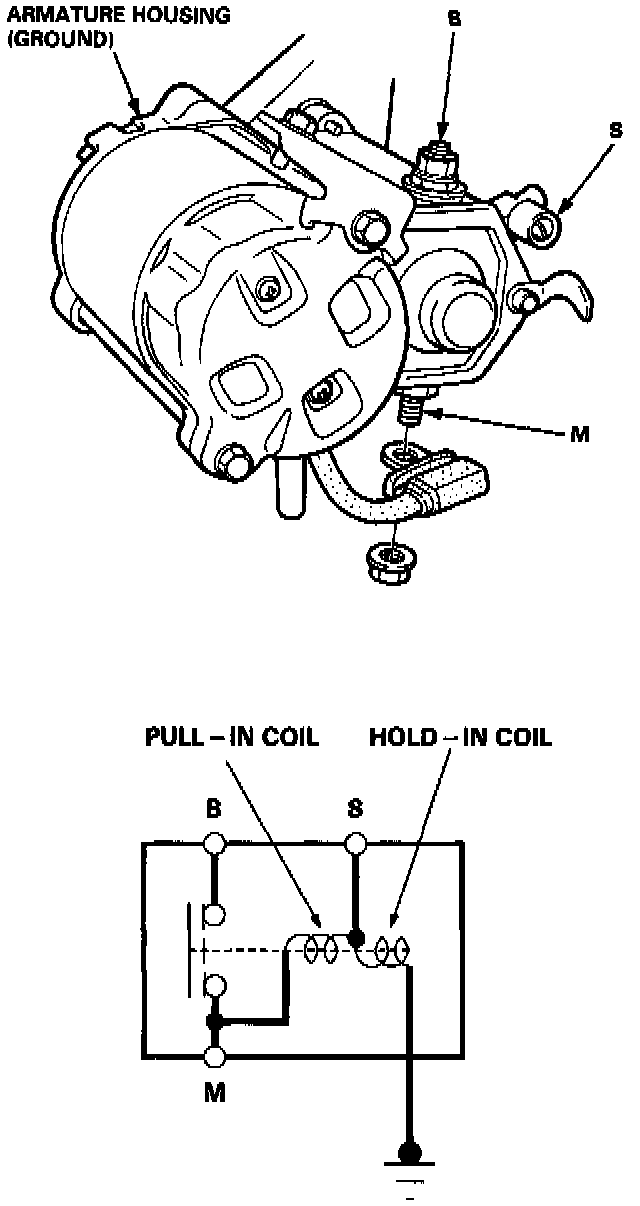1. Check the hold-in coil for continuity between the S terminal and the armature housing (ground). Coil is OK if there is continuity.