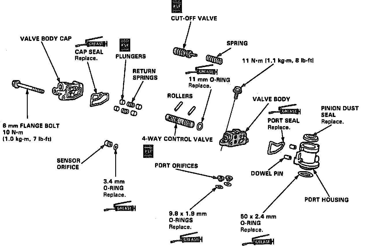 1. Thoroughly clean all disassembled parts, then coat plungers, cut-off valve and 4-way control valve surfaces with power steering fluid.