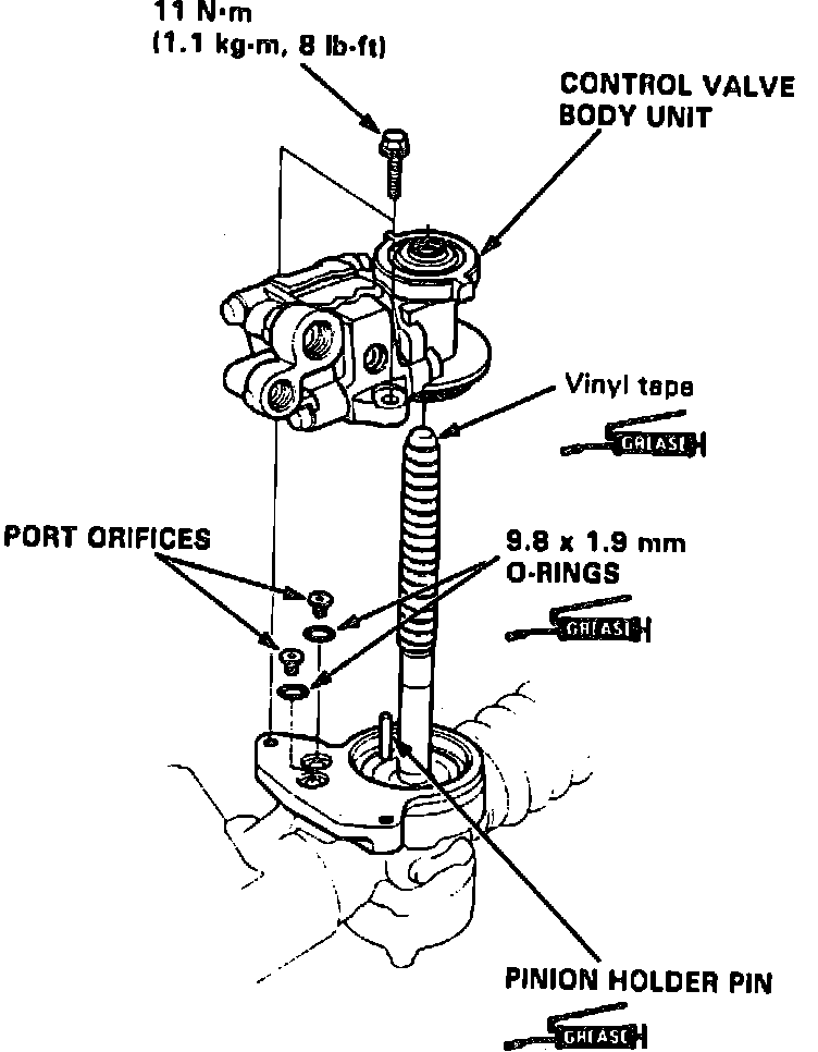 11. Coat O-rings and pinion holder pin with grease, then install them with the port orifices.