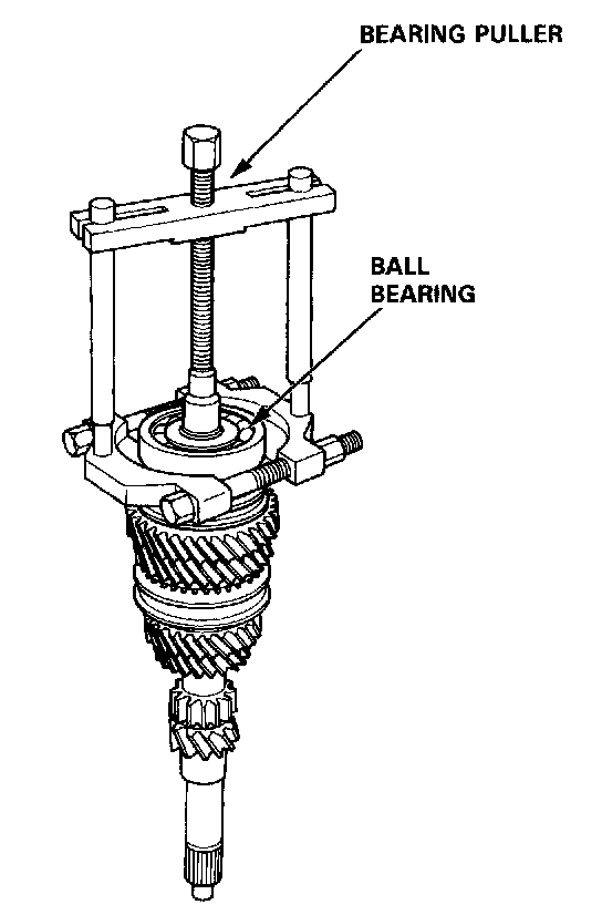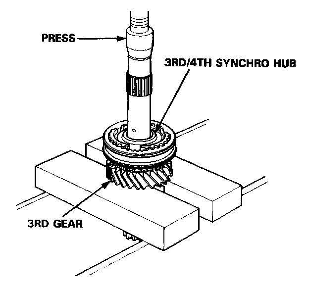 CAUTION: Remove the synchro hubs using a press and steel blocks as shown. Use of a jaw-type puller can cause damage to the gear teeth.