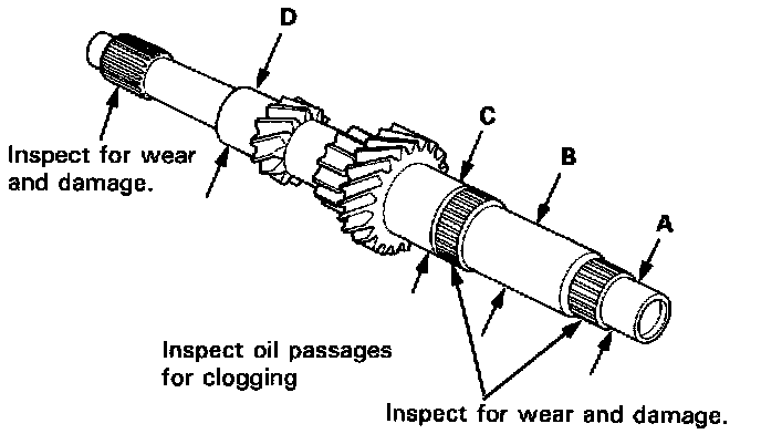 1. Inspect the gear surface and bearing surface for wear and damage, then measure the mainshaft at points A, B, C, and D.