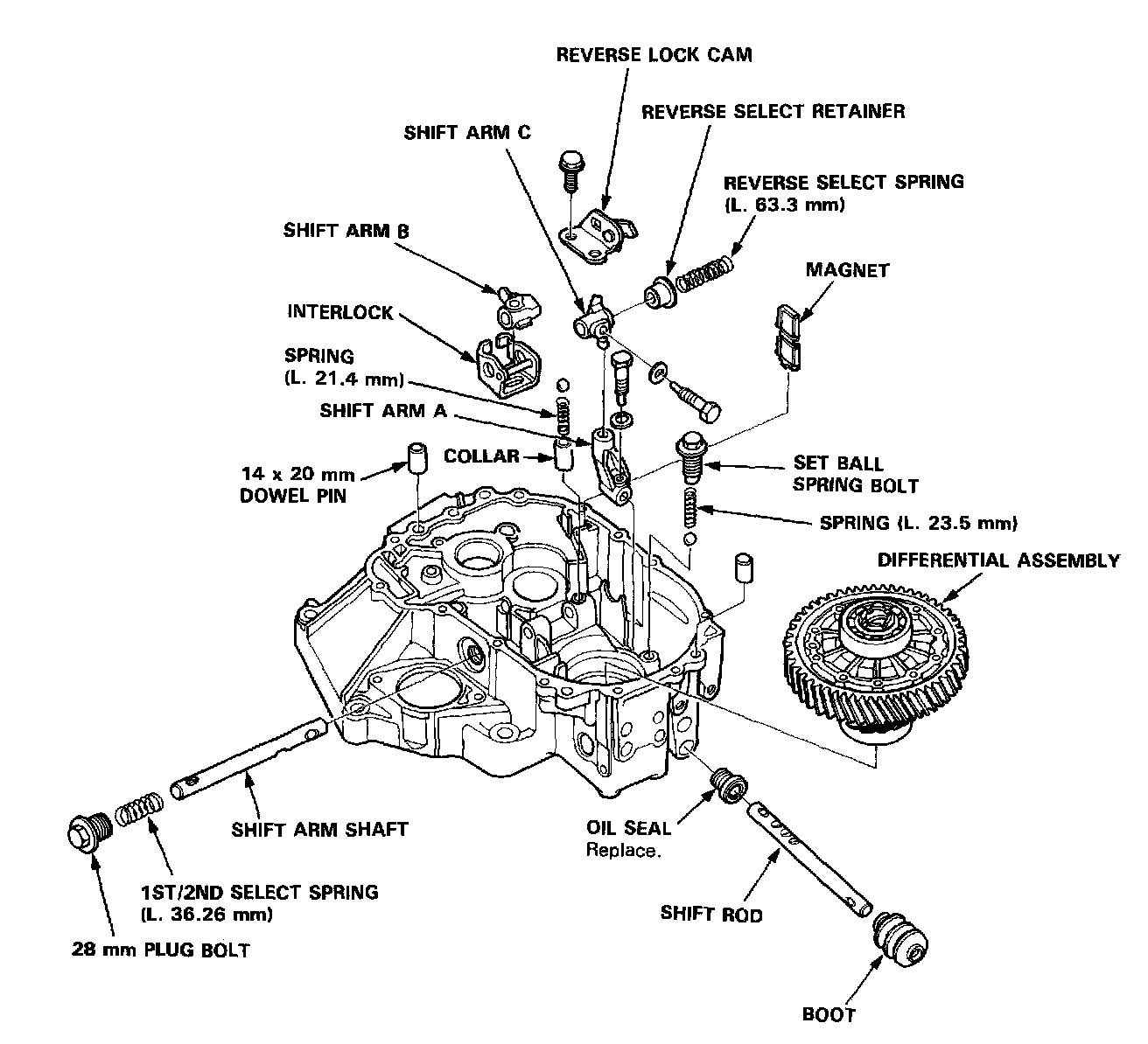 6. Remove shift arms C and B, and the interlock, then remove the reverse select spring and reverse select retainer.