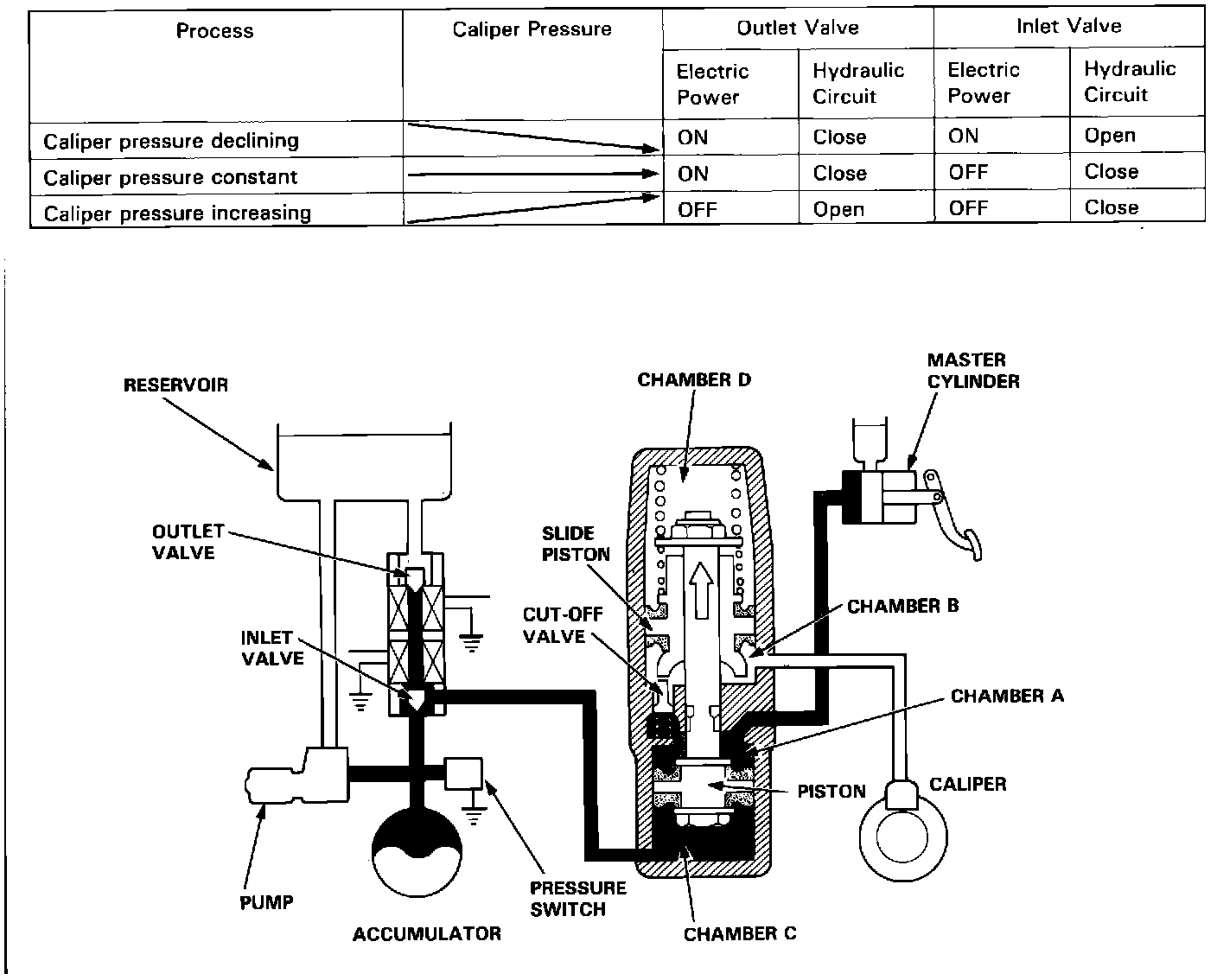 ^ If brake inputs (force exerted on brake pedal) are excessively large and a possibility of wheel locking occurs, the ABS control unit operates the solenoid valve, closing the outlet valve and opening the inlet valve. As a result, the high pressure is directed into chamber C, the piston is pushed upward, causing the slide piston to move upward and the cutoff valve to close. As the cut-off valve closes, the flow from the master cylinder to the caliper is interrupted, the volume of chamber B, which is connected to the caliper, increases, and the fluid pressure in the caliper declines.