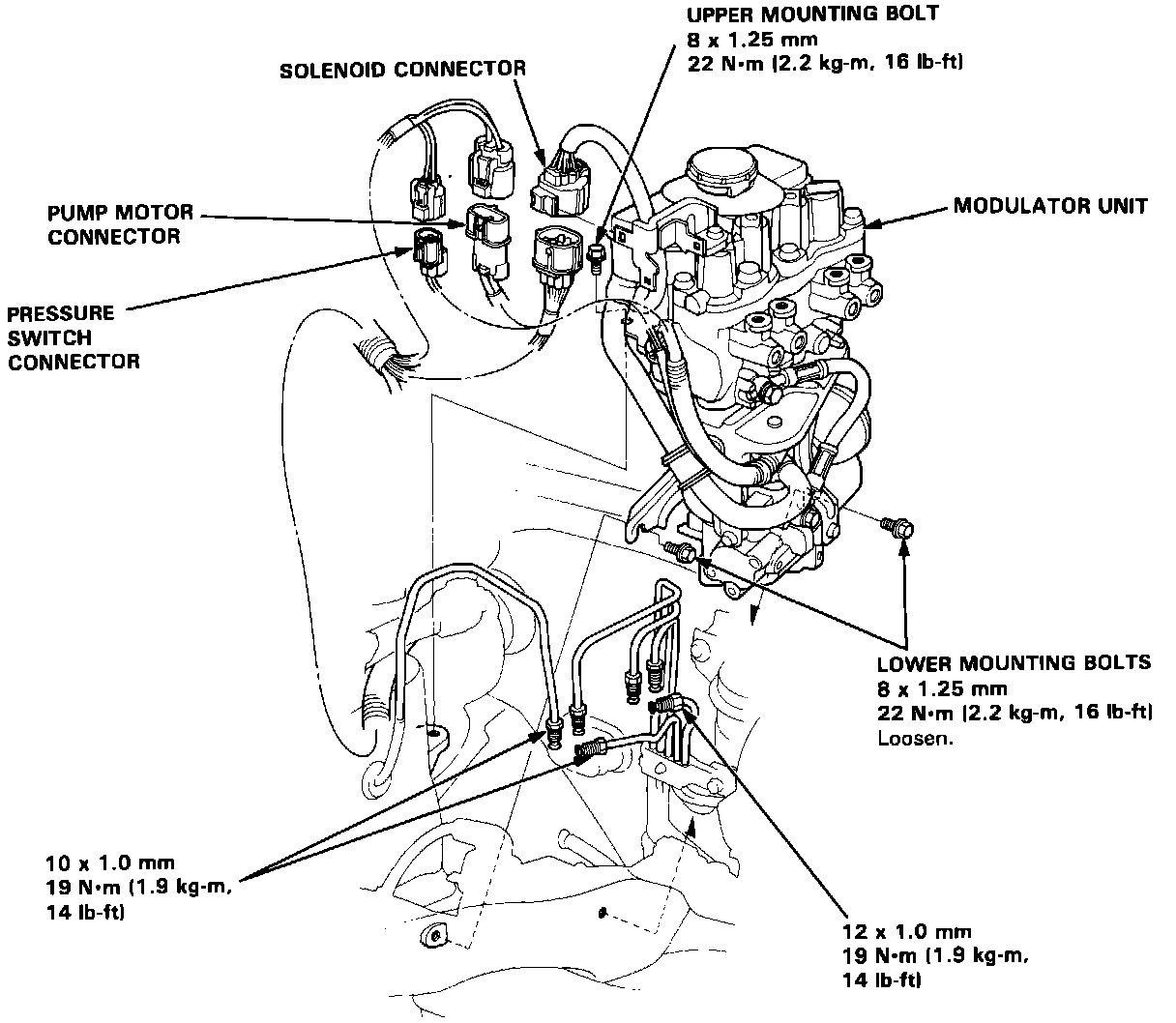 6. Loosen the two lower mounting bolts, and remove the upper mounting bolt and the modulator unit from the frame.