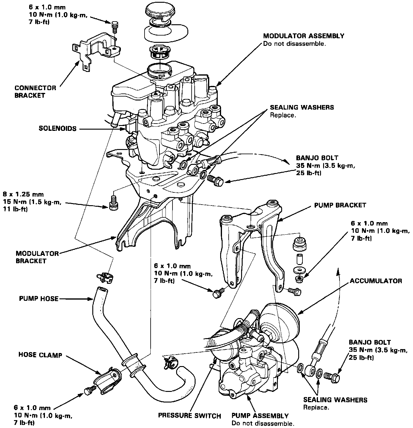 WARNING: Before removing the modulator-to-pump high-pressure line, be sure to relieve the fluid pressure via the maintenance bleeder, refer to System Service / Relieving Accumulator/Line Pressure.