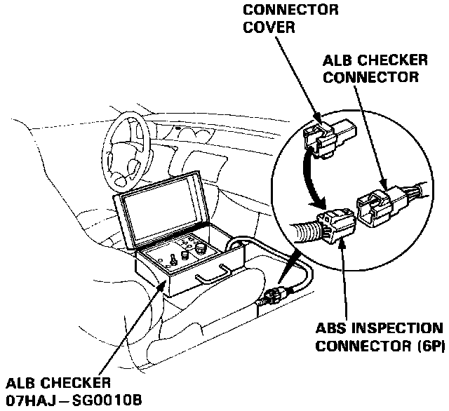 1. Disconnect the ABS inspection connector (6P) from the connector cover located on the cross-member under the passenger's seat and connect the ABS inspection connector (6P) to the ALB checker.