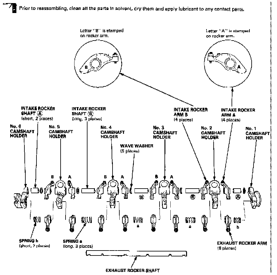 When removing or installing rocker arm assembly, do not remove camshaft holder bolts. The bolts will keep the holders, springs and rocker arms on the shaft. When reassembling, fit the projection on the intake rocker shaft to the notch in the camshaft holder.