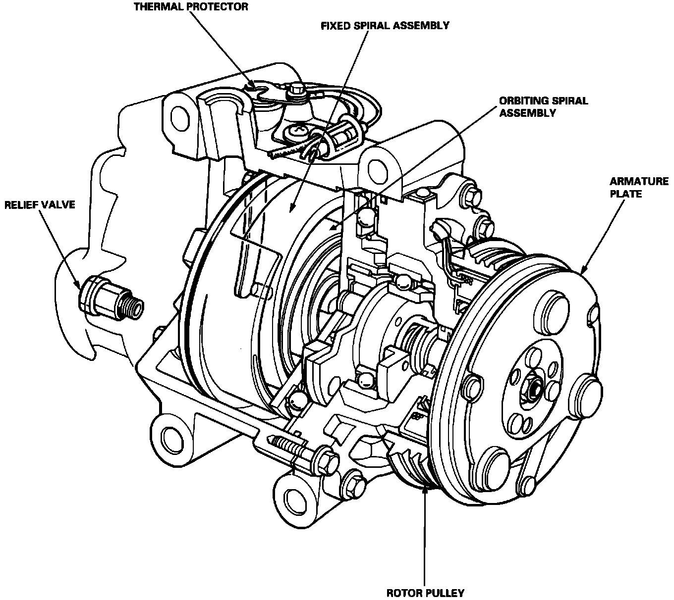 This compressor is a Sanden spiral type for R-134a. Refrigerant is compressed between a fixed spiral assembly and an orbiting spiral assembly. A thermal protector is installed on this compressor.