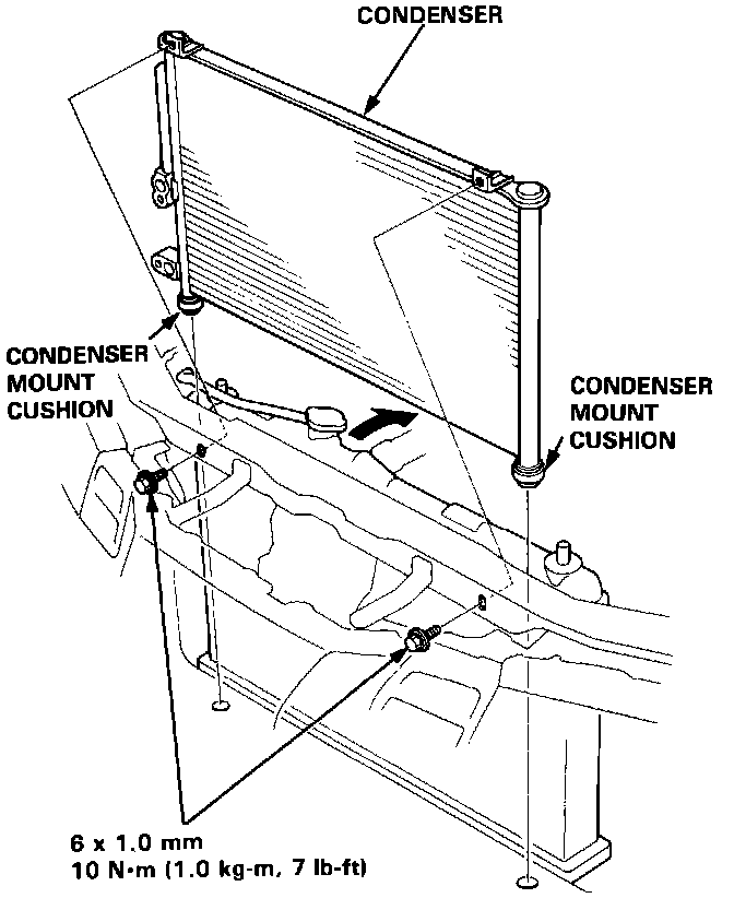 CAUTION: Do not damage the radiator and condenser fins when removing the condenser.