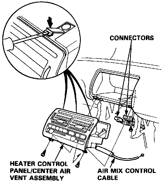 4. Remove the three self-tapping screws. Disconnect the connectors and remove the heater control panel/center air vent assembly.