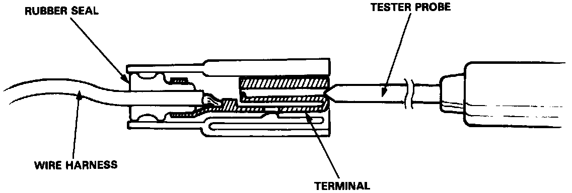 - For testing at connectors other than the test harness, bring the tester probe into contact with the terminal from the connector side of wire harness connectors in the engine compartment. For female connectors, just touch lightly with the tester probe and do not insert the probe.