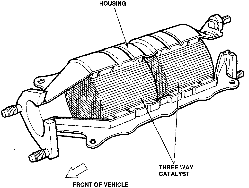 The catalytic converter is a monolythic three-way device that uses catalytic compounds applied to an integrally constructed honeycomb carrier surface in the center of the exhaust pipe.