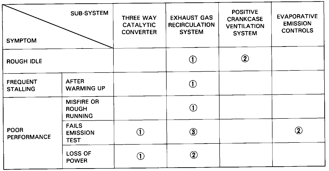 NOTE:Across each row in the chart, the sub-systems that could be sources of a symptom are ranked in the order they should be inspected starting with (1). Find the symptom in the left column, read across to the most likely source. If inspection shows the system is OK, try the next most likely system (2), etc.