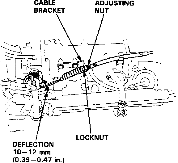 4. If cable deflection is not within specifications, loosen the locknut and turn the adjusting nut until the deflection is as specified.