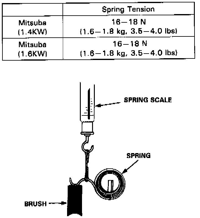 2. Insert the brush into the brush holder, and bring the brush into contact with the commutator, then attach a spring scale to the spring. Measure the spring tension at the moment the spring lifts off the brush.