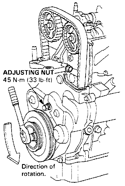 5. Rotate the crankshaft counterclockwise 3 teeth on the camshaft pulley, then reloosen the adjusting nut to create tension on the timing belt.