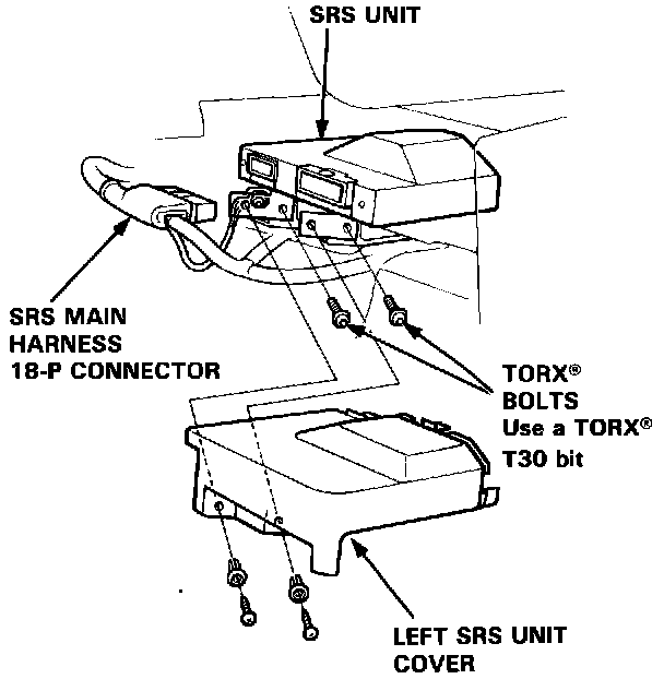 5. Remove the four TORX bolts from the SRS unit, then pull out the SRS unit from the driver's side.