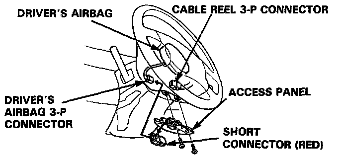 - Disconnect the connector between the driver's airbag and cable reel, then install the short connector (RED) on the airbag side of the connector.