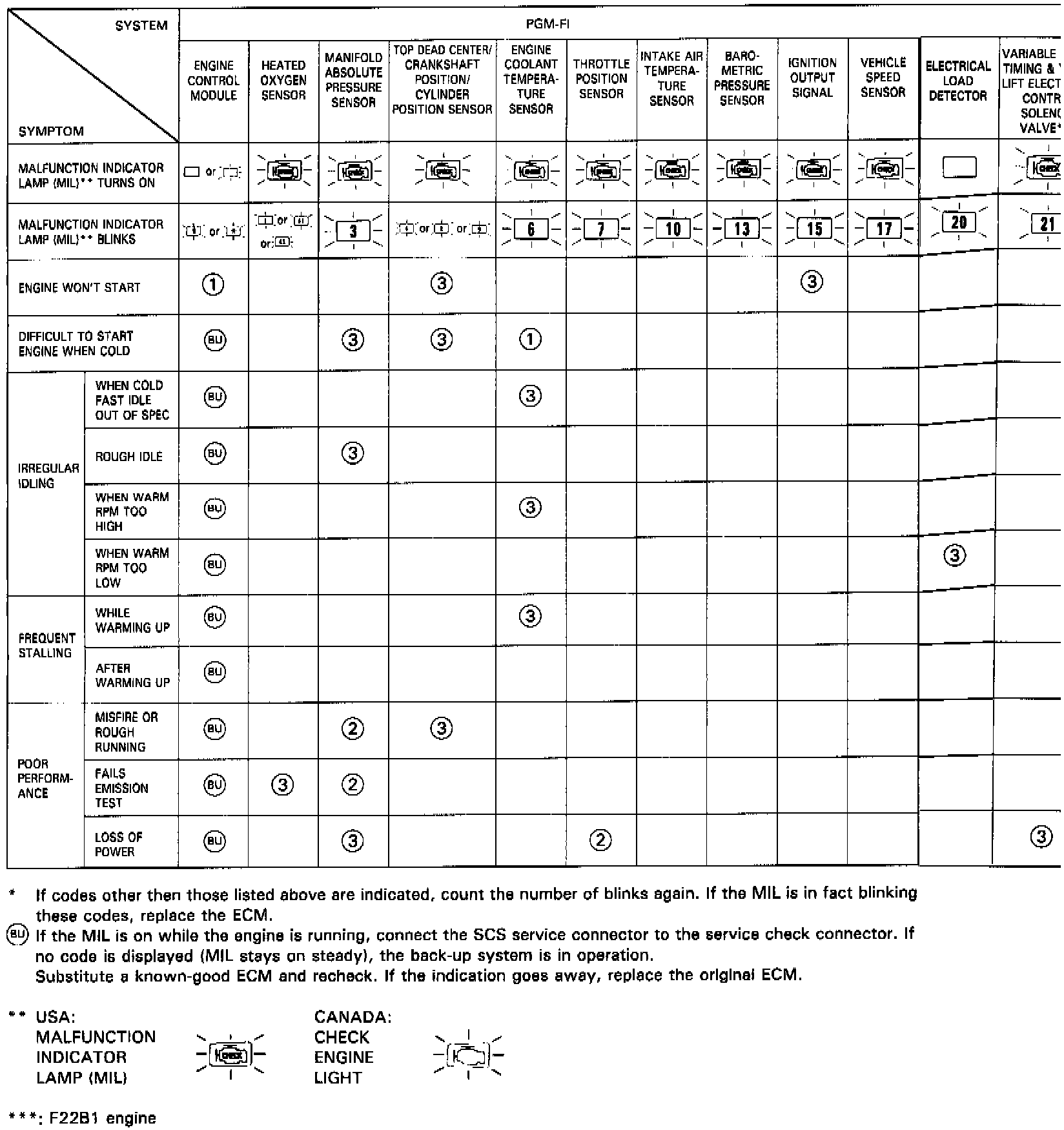 NOTE: Across each row in the chart, the sub-systems that could be sources of a symptom are ranked in the order they should be inspected starting with (1). Find the symptom in the left column, read across to the most likely source. If inspection shows the system is OK, try the next most likely system (2), etc.