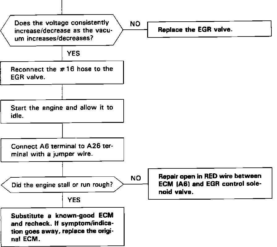 The ECU contains memories for ideal EGR valve lifts for varying operating conditions. The EGR valve lift sensor detects the amount of EGR valve lift and sends the information to the ECU. The ECU then compares it with the ideal EGR valve lift which is determined by signals sent from the other sensors. If there is any difference between the two, the ECU cuts current to the EGR control solenoid valve to reduce vacuum applied to the EGR valve.