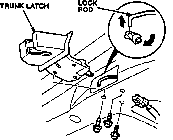 2. Remove the three 6 mm mounting bolts; then, pull down on the trunk latch assembly, and disconnect the cylinder rod. Remove the latch from the trunk lid.