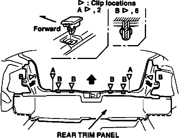 8. Remove the six retaining clips from the rear trim panel, and install them into the body; then, install the rear trim panel in the trunk.