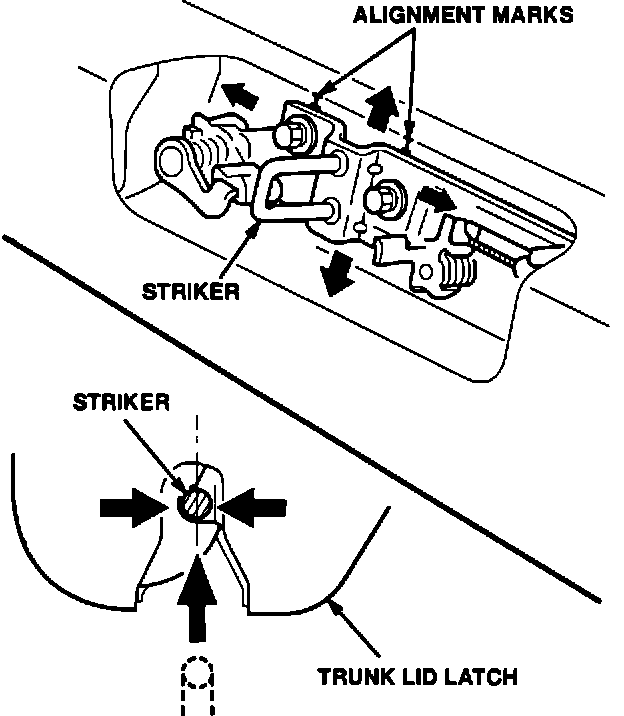 5. Check the alignment of the striker assembly. The top edge of the striker plate should be even with the right and left alignment marks on the body, and the striker should be centered on the latch as you close the trunk lid.