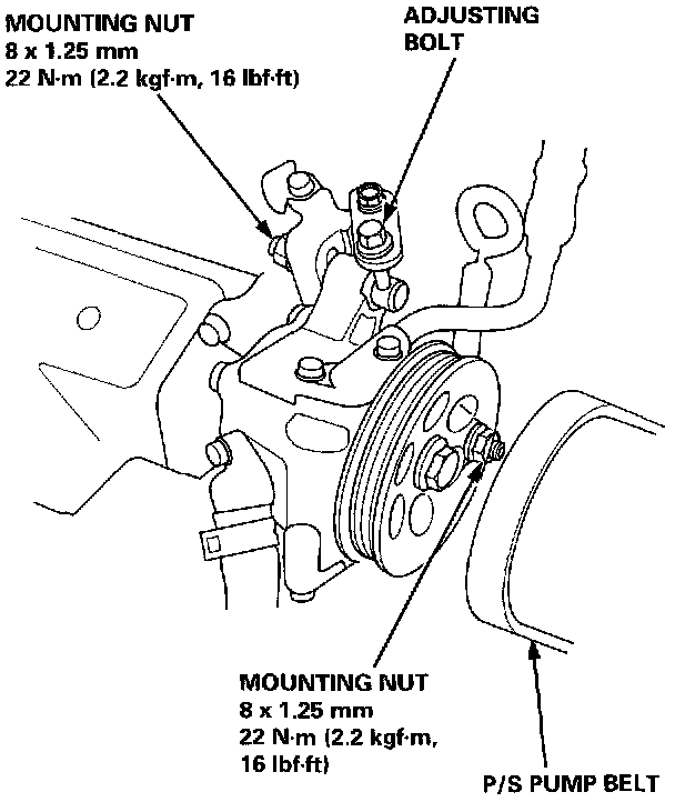 3. Loosen the adjusting bolt and mounting nuts, then remove the power steering (P/S) pump belt.